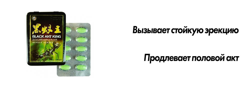 Черный Королевский Муравей (капсулы Black Ant King) – препарат вызывающий стойкую и длительную эрекцию. Содержит фермент, получаемый из организма черных африканских муравьев. Купить Black Ant King можно лишь раз и после нескольких применений данный фермент начинает вырабатываться и действовать самостоятельно.