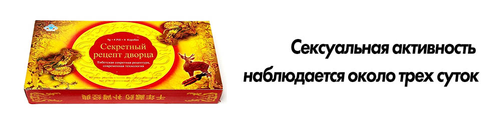 Таблетка-шарик «Секретный рецепт дворца» начинает действовать аналогично синтетическому стимулятору при употреблении за полчаса до сексуального контакта. Повышенная сексуальная деятельность может наблюдаться до 3 суток. В этот период принимать повторно препарат не рекомендуется. Для достижения легкого эффекта, достаточно выпить половину шарика. Натуральный состав бада сводит к минимуму проявление побочных реакций. Употребление похожих стимуляторов и алкоголя исключить.