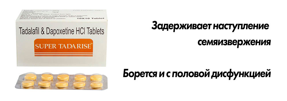 Супер Тадарайз – это дженерик с двойным действием. Препарат помогает избавиться от эректильной дисфункции и преждевременной эякуляции. Содержит в составе 2 действующих вещества: Тадалафил и Дапоксетин, которые безотказно действуют на организм и помогают наладить сексуальную жизнь. Средство обладает эффективностью и быстродействием.